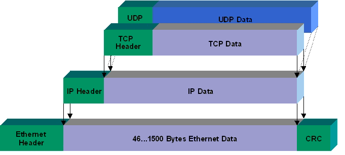 (图片说明:IP 数据包在以太网数据包里面,TCP 数据包在 IP 数据包里面。)