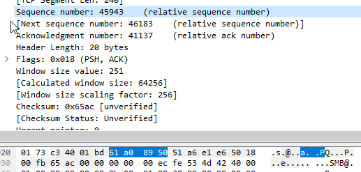 (图片说明:当前包的编号是45943,下一个数据包的编号是46183,由此可知,这个包的负载是240字节。)
