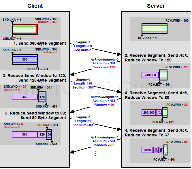 (图片说明:每个 ACK 都带有下一个数据包的编号,以及接收窗口的剩余容量。双方都会发送 ACK。)